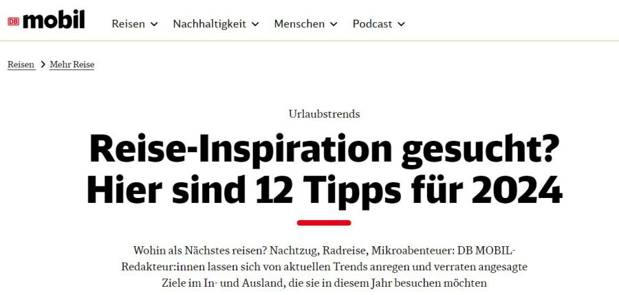 Das Deutsche Bahnmobil-Magazin (DB-MOBIL) empfiehlt unsere Wanderung schon zum zweiten Mal und als 12 Reisetipps mit der deutschen Bahn im Jahr 2024!