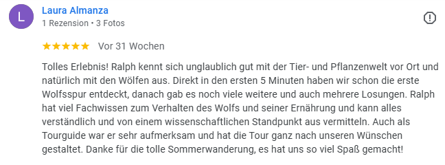 "Wir durften am 30.03.19 an einer sensationellen Wolfswanderung teilnehmen . Selbst nach nur einer Woche sind wir immer noch begeistert von den vielen Eindrücken die uns Ralph Scheel übermitteln konnte. Viel Wissenswertes über die Wölfe und deren Lebensraum hat uns Lust auf weitere Exkursionen gemacht. Diese Tour ist zu 100% weiterzuempfehlen."