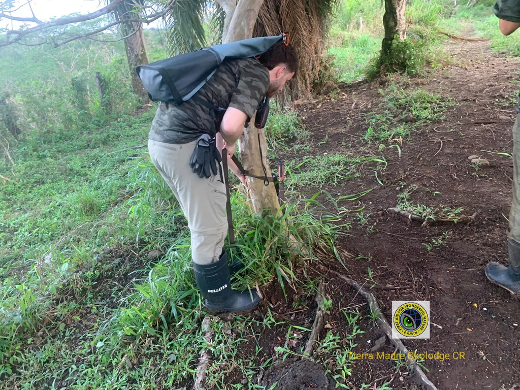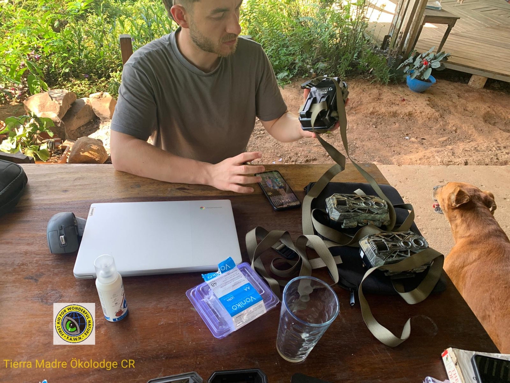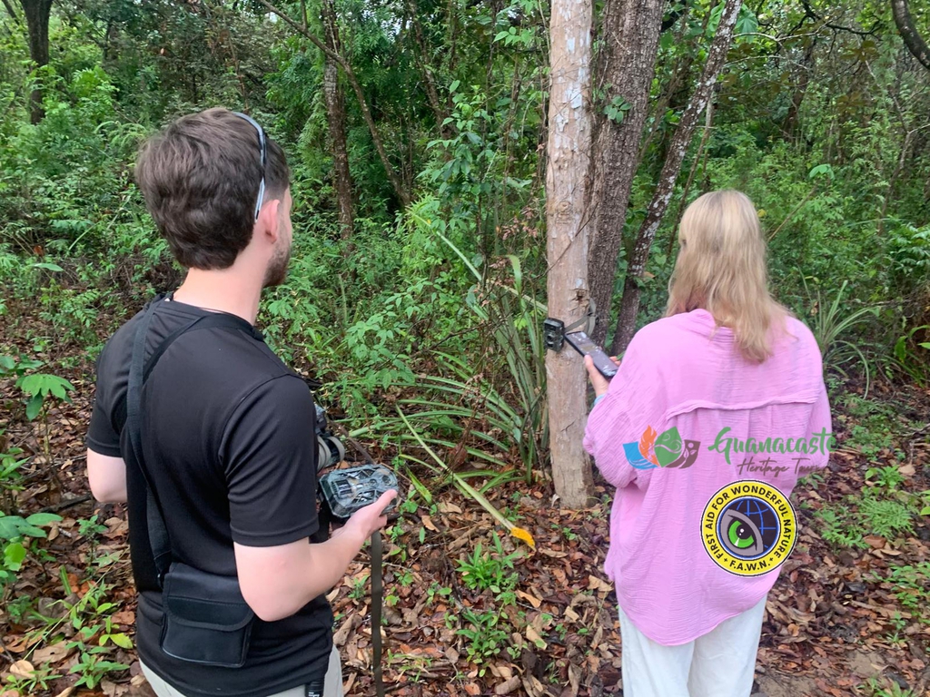 Testen und Training der Wildkamerafallen im Projekt Guanacaste Heritage Tours in Guanacaste/ Costa Rica (Mai 2025). Vielen Dank an die dt. Touristin, die uns tatkräftig unterstützte.